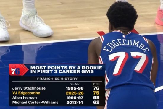 同時,埃奇庫姆也打破艾弗森的紀錄,成為76人隊史前三場比賽得分第二多的球員。
