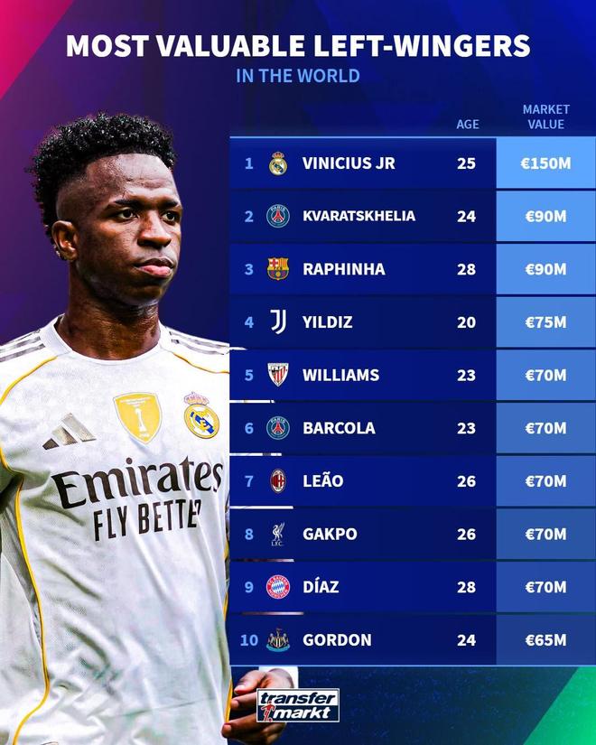 在完成最新一次身價更新后,德國轉(zhuǎn)會市場網(wǎng)站列出了世界足壇左邊鋒身價榜,維尼修斯以1.5億歐居首,克瓦拉茨赫利亞、拉菲尼亞緊隨其后。